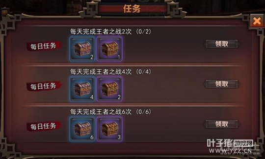 开启条件 在开服5天后,周四至周六限时开启 规则: 1、 王者之战是1个跨服匹配战,在这里可以匹配到来自各个服务器的玩家战斗 2、 王者之战每个赛季开始时所有玩家战绩清零 3、 每天12:00-14:00和18:00-22:00,玩家可以参与王者之战 4、 在活动开启时,点击开始匹配进入匹配,匹配到玩家就会进入战斗 5、 每天有5次数免费挑战,再次挑战需要花费钻石购买,次日挑战次数刷新 段位说明: 1、 在赛季开始时,所有玩家段位为10段 2、 当玩家战斗结束后,根据战斗结果将会升星降星,连胜可以获得2星 3、 玩家当升至最高段位将会进入传说,传说计算积分 4、 根据玩家对手的积分,自己获胜后将会获得一定积分 5、 根据玩家的段位和积分计算最终排名 奖励说明: 1、 每场战斗胜利或失败可以获得奖励 2、 每日挑战一定场数可以获得奖励,点击任务可以领取 3、 赛季胜利一定场数可以获得奖励,点击任务可以领取 4、 每日根据段位,邮件发送奖励 5、 升段后,就会获得升段奖励,点击升段奖励可以领取 6、 在赛季结束后,根据玩家最终排名将会邮件发放一次奖励 [编辑:叶子猪小秘书]