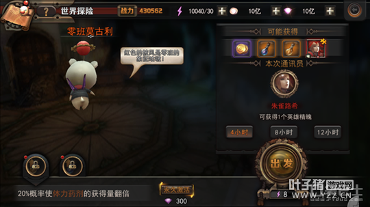 游戏中通关普通副本4-3的玩家可以开启世界探险玩法。玩家可以通过探索不同的地区获得各种丰厚的奖励。 探险规则: 1、每位玩家都可以探索一块属于自己的世界版图,版图分为很多个区域,玩家初次探索某一区域时必须战胜该地区的守关BOSS,击败首领后便可以派遣自己的英雄持续对该区域进行探索了。同时,击败守关BOSS还有一次性钻石奖励 2、每个区域的特产都有所不同,在不同区域探险可以获得不同的奖励。探险需要精力,探险时长越高,消耗精力越多,获得的奖励也会越多,建议玩家们选择12小时档位进行探险,既省心省力、又能在探索结束后获得不菲的收益。 3、拜访好友时有概率发现士气低落的莫古利,帮助好友鼓舞士气可以获得钻石奖励。 [编辑:叶子猪小秘书]