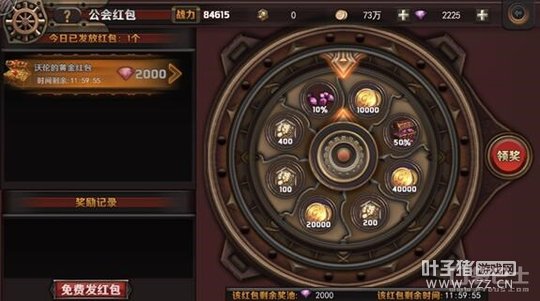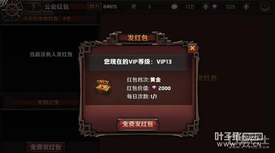 当玩家进入公会后,可通过公会船舱中的公会红包按钮进入玩法界面 玩法规则: 1、vip5等级以上的玩家,每天可以免费在公会中向其他玩家发放一次红包,,每个公会成员都可以开启一次,通过转盘获取各种奖励 2、红包包含各种资源奖励以及钻石奖励,红包中包含一定量的初始钻石,当玩家通过转盘获得奖池百分比奖励时即可获得红包奖池中一定比例的钻石,抽奖的玩家如果没有获得钻石奖励,系统就会为红包奖池累积一定量的钻石。 3、红包的品质分为3档,发放高级红包需要更高的vip等级,奖励也更丰厚。在奖励记录中还可以查看公会内其他玩家的领奖记录,比比谁的运气更好。 [编辑:叶子猪小秘书]