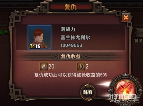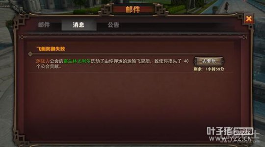 我们之前已经介绍了飞艇运输,当然飞艇运输的收益伴随着危险,在运输线上,经常会有飞艇被抢劫的事件发生。 那对于抢劫我们的强盗,我们必须要复仇。 首先在自己的飞艇被抢劫之后,我们马上就能收到飞艇防御失败的消息 这时会发现消息中,出现了“去复仇”的按钮,点下他,就可以查看到抢劫者的信息 这时点击进入战斗,将会复仇抢劫者发生战斗 每次被抢劫后,只能在2小时内复仇,过时将不能复仇,而且在此期间,只能复仇一次 复仇成功后,将会得到被抢走收益的50%,如果复仇不幸失败了,也能获得一点奖励 [编辑:叶子猪小秘书]