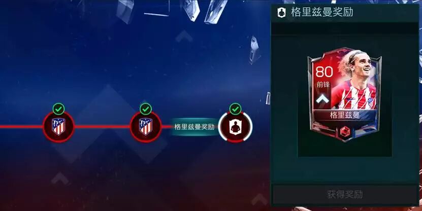 逆转战胜马德里竞技,赢取绿茵巨星格里兹曼 “绿茵巨星”的每个比赛节点都会为您设定一个小的情景,在难度最高的第三个节点,您将需要操控自己的球队,在上半场1球落后的情况下,击败92综合能力的马德里竞技。