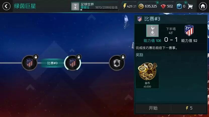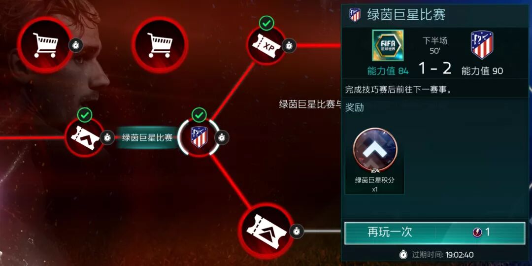 当体力购买完毕,比赛节点也会随之解锁。这是一个您可以在一天内反复游玩的节点。与之前类似的,您需要在下半场1球落后的情况下,击败90综合能力的马德里竞技队。每体验1次消耗1点您刚刚获得的专用体力,每赢得1场胜利可以获得1点绿茵巨星积分。