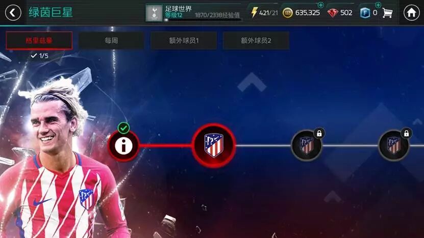 “绿茵巨星”活动分为四个章节:“格里兹曼”、“每周”、以及两个额外球员章节。只要您的球队能力值达到78或以上,您就可以 随时 在“格里兹曼”节点挑战马德里竞技。