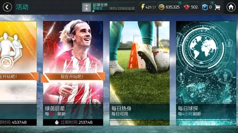 各位玩家好!通过“绿茵巨星”活动,您将有机会 免费 获得超级球星格里兹曼以及相关升级道具,这是您在中前期获得免费精英球员的绝佳途径。详细玩法内容可以在“主界面——活动——绿茵巨星”中查看。