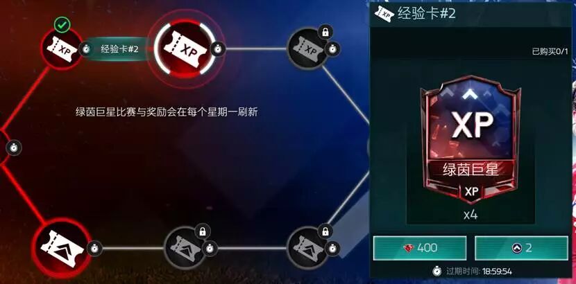 下面的工作就是简单直接的领奖环节了,您可以使用刚刚获得积分解锁奖励节点,每个节点的奖励仅能领取一次。上面的一条路线对应了绿茵巨星经验的获取,而下面的则对应了专属球员天赋的获取,两种道具都只能用于“绿茵巨星”活动产出的球员(比如您刚刚获得的格里兹曼)。当然,如果您的技术足够出色,您也可以试着去解锁全部的奖励节点,这将给您带来额外的奖励收入。
