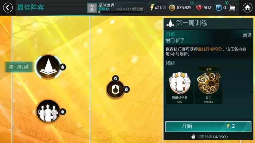 在界面中用“白色球员”图标表示的是全场比赛节点。玩家需要与11名本周最佳球员组成的队伍进行对战并最终获得胜利。这个节点的奖励积分与消耗体力都相对较高,对于新手玩家来说可能会有一定的难度,如果您的阵容还不够强力,可以考虑通过反复挑战技巧赛事节点的方式赚取积分。该节点不可重复,每24小时仅能完成一次。