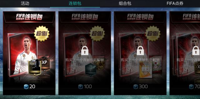 玩家大大们好~ 为您精心准备的超值连锁礼包 已于 3月17日 上架啦! 本次超值连锁礼包 可以百分百获得精英球员呦! FIFA足球世界连锁包 上架时间: 2018年3月17日 限购规则: 活动期间单个帐号可在商城 限购1次