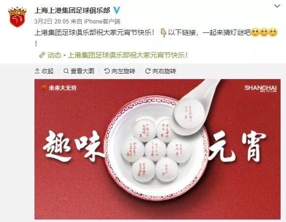 上海上港在中场首轮中 8-0狂胜大连一方 。在比赛之前,上港发布了庆祝元宵节的海报。 恰巧的是,海报上的八颗汤圆对应了本场比赛的8粒进球 。赛前,上港官方通过微博分享了这幅主题为“趣味元宵”的海报,并说道:“上港集团足球俱乐部祝大家元宵节快乐!点击以下链接,一起来猜灯谜吧!”