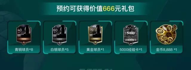 ,内含青铜球员卡8张、白银球员卡5张、黄金球员卡1张,5000经验卡1张以及8888金币。