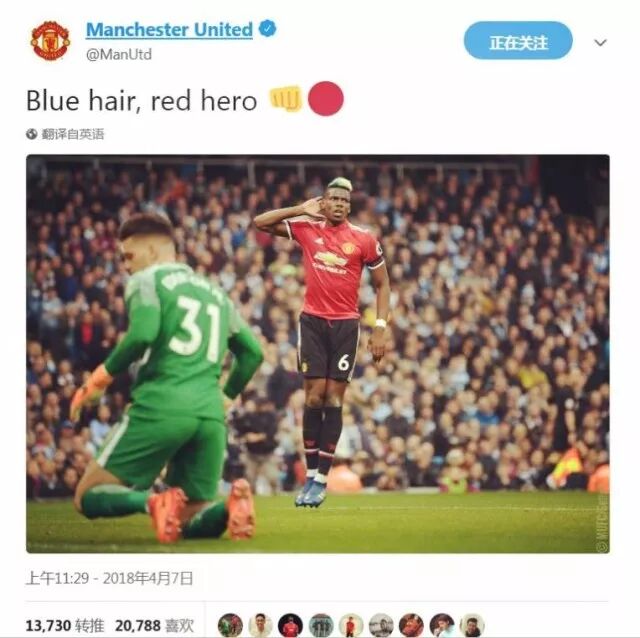 北京时间4月8日凌晨,英超焦点战曼市德比上演,曼联在客场连扳3球3-2逆转曼城,没有成为同城死敌提前夺冠的背景板,红魔中场博格巴在本场比赛下半场表现出色,2分钟2球拯救了球队。赛后红魔官推称赞法国中场