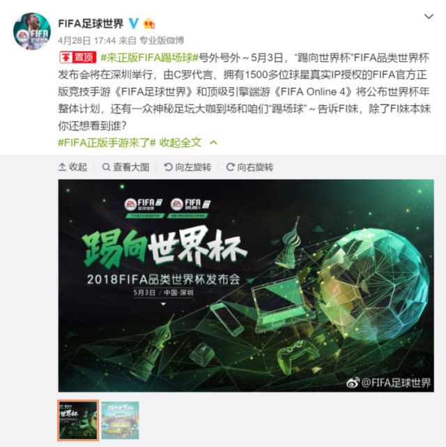 4月28日, 《FIFA足球世界》 官微再次发布重磅消息:5月3日在深圳将举办 “踢向世界杯”FIFA品类世界杯发布会 ,相信本次发布会对热爱足球游戏的玩家来说绝对是一份惊喜。