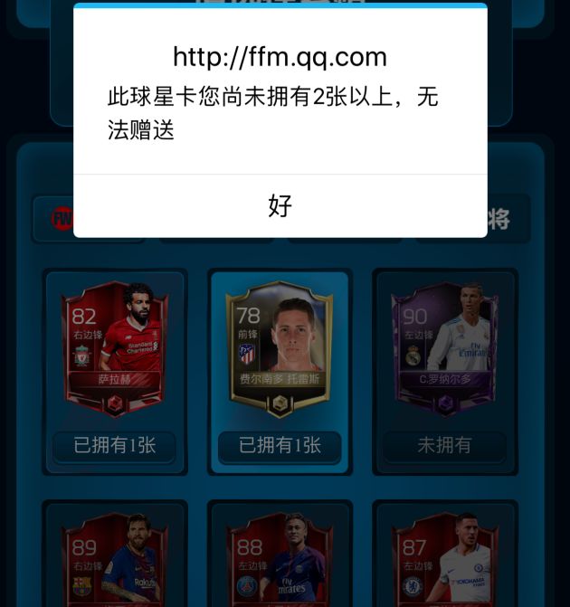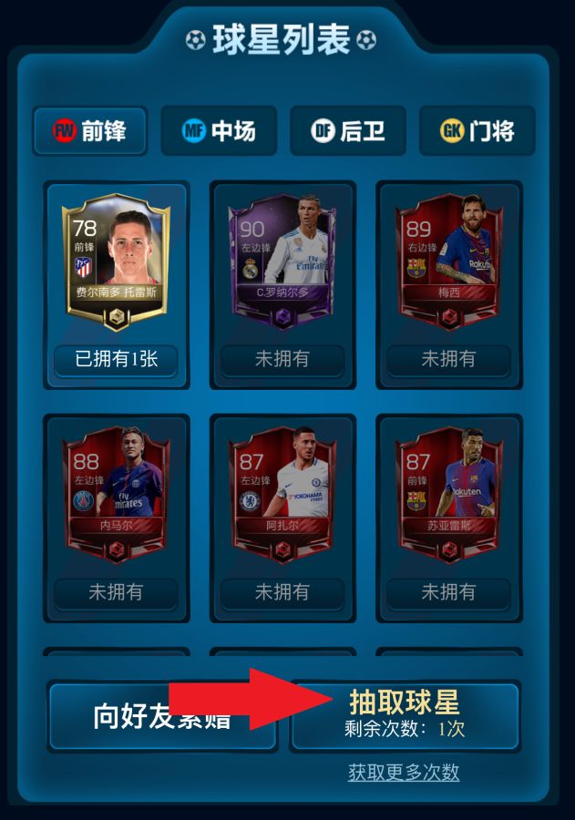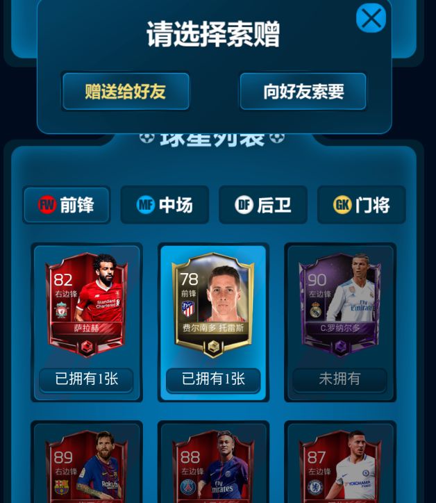 除了每天自己抽取球星外,你还可以通过点击上方 索赠球星 ,向好友索取或者赠送球星。 (娜姐提示只有当你拥有2张以上这位球星的球星卡时才能赠送好友)