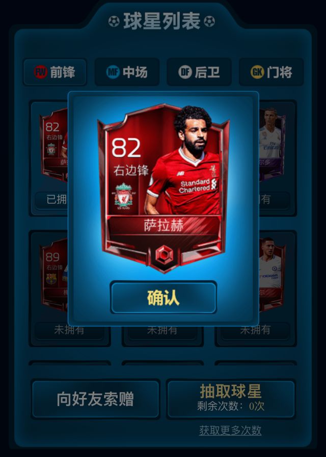 点击 抽取球星 ,跳到 球星列表 ,点击右下方获取你的球星卡。(哼哼,娜姐抽到当红炸子鸡 萨拉赫 了哟)