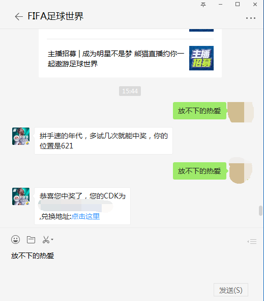 在FIFA足球世界公众号后台回复助威口号“ 放不下的热爱 ”