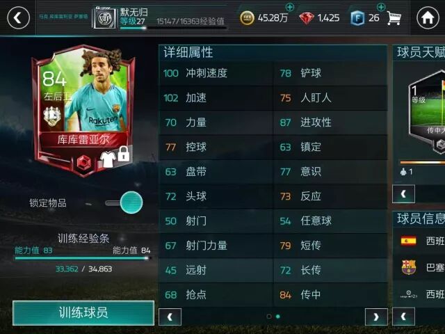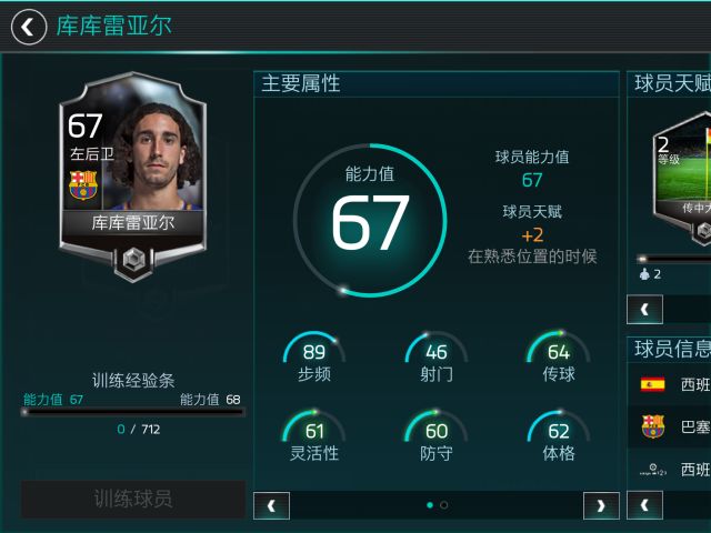 左后卫 库库雷亚尔 巴萨2队 巴萨2队 的库库雷亚尔,是《FIFA足球世界》中 第一期玩家推荐阵容 的银卡球员,在推荐阵容中他的评分是69,市场上购买的是67。 作为一张总评只有67的卡, 步频 却已经达到了惊人的 89 ,球卡升级之后速度值 直破三位数 。前期在实时对战中,你甚至可以拿库库雷亚尔带球直接 从后场杀到对方禁区射门 ,就连对方的前锋都只能对你 望尘莫及 。 娜姐 库库蝴蝶发型了解一下~