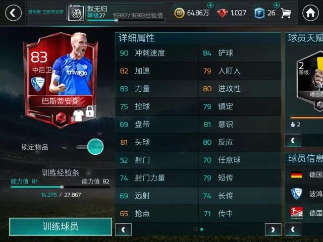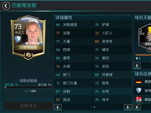 中后卫 巴斯蒂安斯 波鸿 德乙波鸿的巴斯蒂安斯,今年1月有资讯称他 转会 了天津泰达。虽然他的 身高 达到了 188 ,但作为中后卫来说,他的 速度也不慢 。 娜姐为什么要推荐这名球员呢,主要是因为他在中后卫的位置上 步频不慢 ,甚至比不少红卡中后卫要快,再一个他的 其他能力值 和红卡球员比也不逊色,虽然体格方面或许欠缺一点点,不过在游戏中大部分前锋根本 撞不过 高大威猛的他。