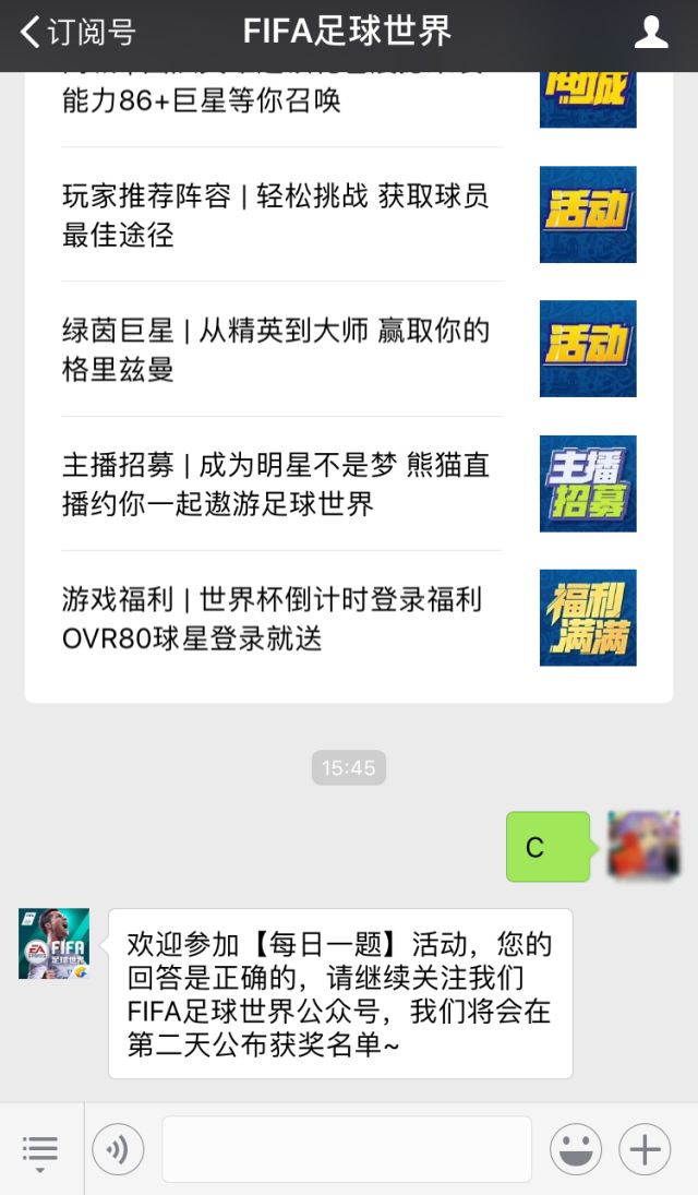 参与方式 在FIFA足球世界公众号后台回复你认为正确的答案序号,如C ,示例如下: