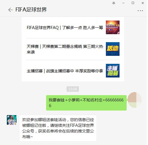 在FIFA足球世界公众号后台 直接回复 “ 我 要套娃+姓名+地址+手机号 ”