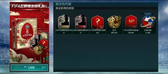 连锁礼包4内容: 79+ 国家队球员 1名 82+ 国家队球员 1名 世界杯提升道具 25 金币 80,000 世界杯经验值 16,000 交换点数 1,288 售价:1,288点券