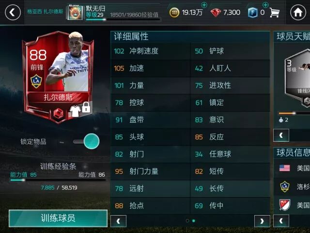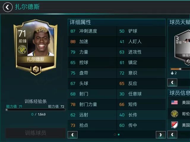 扎尔德斯 前锋 初始评分:71 不管你是不是球迷,不管你是不是关注 洛杉矶银河队 ,只要你玩《FIFA足球世界》,你一定会知道 扎尔德斯 这个名字,如果你不知道......算了算了,当我没说。总之,几乎所有的玩家前期都会使用扎尔德斯。 扎大佬可以说是所有 新手玩家的好朋友 ,他速度快,盘带强,射门能力灵活性都不差,前期不管是副本还是PVP,一个扎尔德斯只要 按着加速用着马赛回旋 ,就可以场场 杀穿对方整条防线 。 前期追上扎大佬?不存在的! 说起来娜姐知道的扎大佬的卡一共有 4种 ,第一种就是系统送给我们的 69的银卡 ,这张银卡是扎大佬所有卡升级后属性最好的,如果不小心喂掉或者卖了的小伙伴们,你们就只能去市场买 71的普通卡 , 72的玩家推荐阵容 或者是 80的VIP扎大佬 啦~