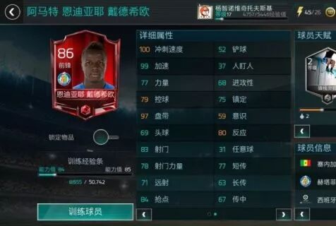戴德希欧 前锋 初始评分:74 来自 塞内加尔 的戴德希欧,如果大家想要 通过国籍搜 这名球员的话千万不要输入恩迪亚耶哦~不然你就会发现,恩迪亚耶仿佛和隔壁老张老王老李一样多。 戴德希欧的 初始盘带值很高 ,不需要升到红卡就已经可以做出 彩虹盘带 。如果娜姐没有记错,咱们的扎大佬好像升到82级左右的时候盘带才刚过90~ 当然这位前锋还是 无法代替 大佬 的,毕竟意识和进攻性差了不少的。