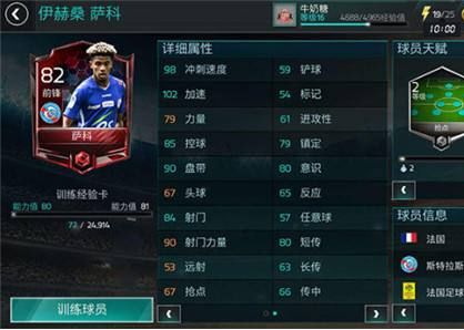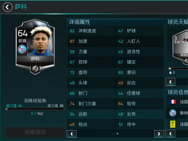 萨科 前锋 初始评分:64 这是一位银卡妖人前锋......好像扎大佬原本也是银卡哈~从初始的数据上来看,除了速度之外,64的银卡萨科在 射门 , 短传 以及 意识 上的数值都还不错。 升级之后的萨科速度妥妥上了100,射门力量也上了90,然而...... 反应65 ......这个还是有点难受的。作为一名前锋,门前 反应能力还是挺重要的 ,不过 就速度来说 前期肯定是够用的。