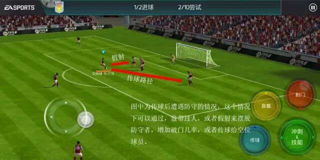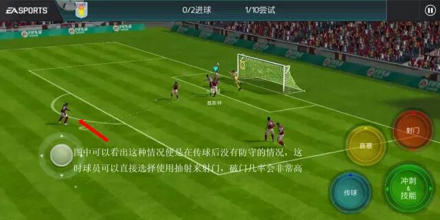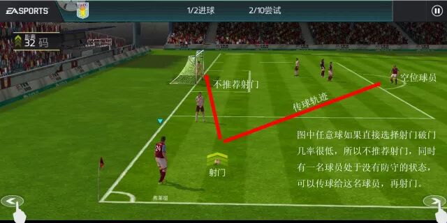 这种情况下射门角度太小,建议玩家直接 传球 给队友。 当队友处在无人防守的空位时,可以 点选 队友。