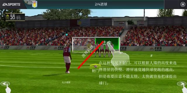建议玩家选择 直接射门 。先左右底角 微调 罚球方向,然后向上滑动 约2/3力量左右 即可。力量太少足球会过不了人墙噢!力量太大则会打门柱甚至于高出球门!