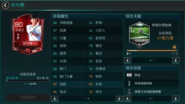 球星推荐:孙兴慜 初始评分:80 微信区价格:45W+~360W+ 初始 要说左前卫的球星有谁,相信不少玩家都会想到” 亚洲一哥 “孙兴慜吧~作为为数不多能在欧洲五大联赛闯出来的亚洲人,孙兴慜让人印象最深刻的,除了他那跑过了防守球员也让队友追不上的速度,还有在面对墨西哥时打入的那一脚高质量的 世界波 ~ 升级 升级后的孙兴慜各项数值平稳成长, 进攻端 所需的各项数值也比他球员总评分要高, 步频 不是他的绝对优势,但是外围 远射 能力强也一定程度上弥补了这些不足。