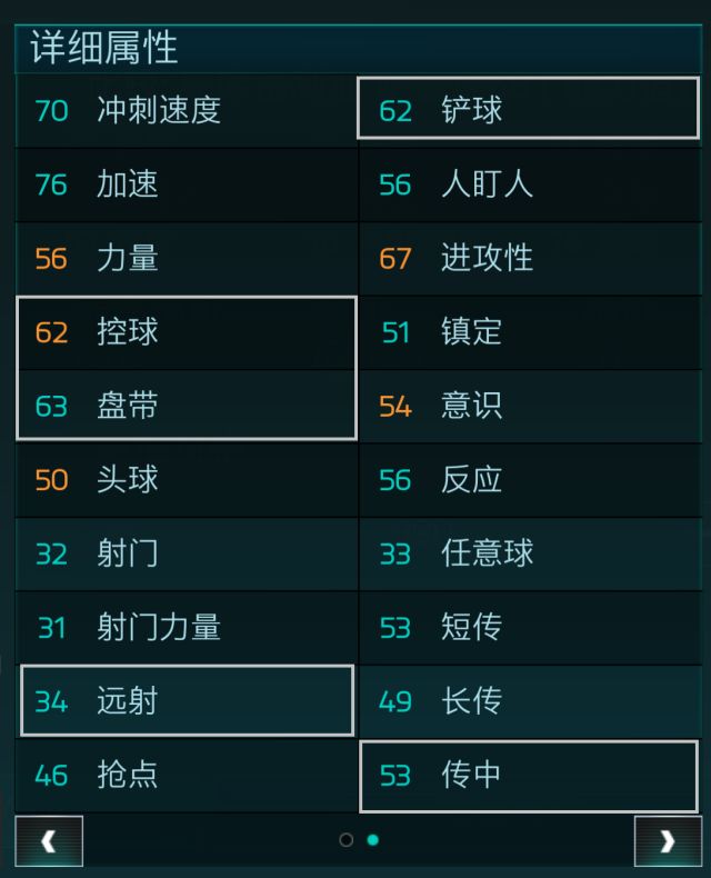 左前卫关键属性:控球,盘带,远射,铲球,传中等。