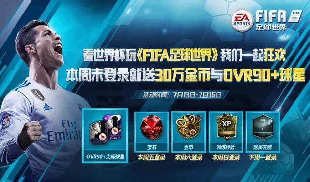 连续登录游戏送球员天赋礼包! 本周五(7月13日) - 下周一(7月16日) 连续四天 登录《FIFA足球世界》即可获得: