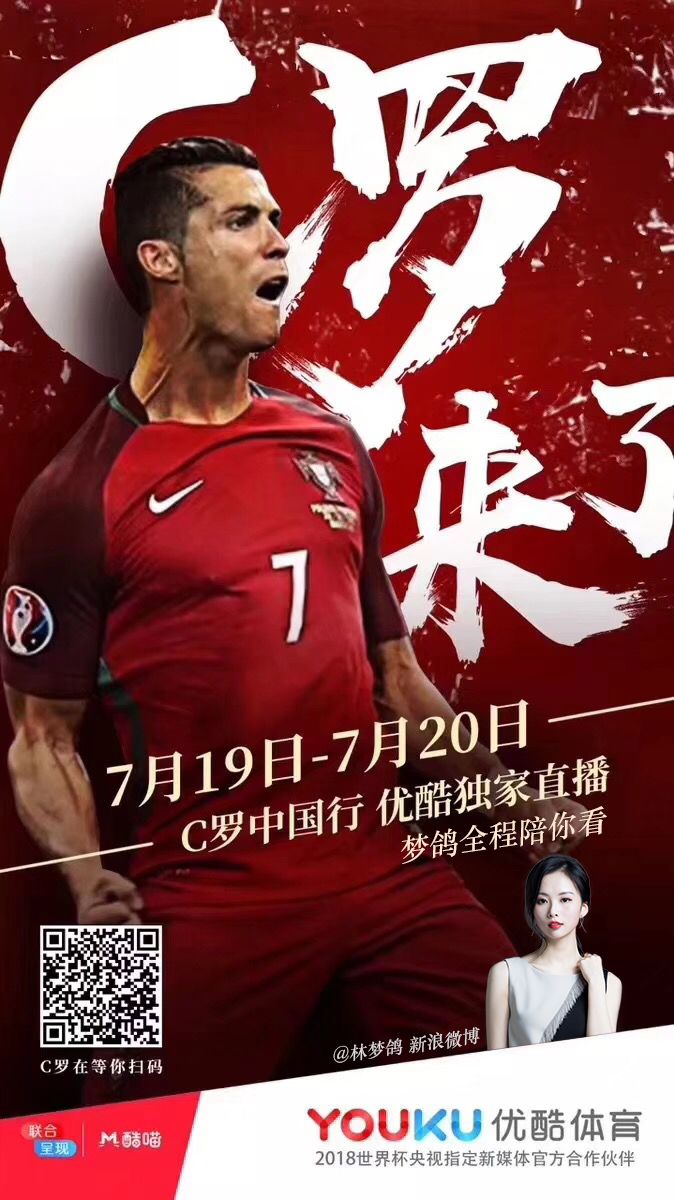 如果没有机会来到现场的话也千万不要伤心。此次C罗的2018中国行,梦鸽将会全程跟随C罗,为大家带来实时的直播内容。 7月19日-20日的C罗中国行,优酷全程带你看C罗。