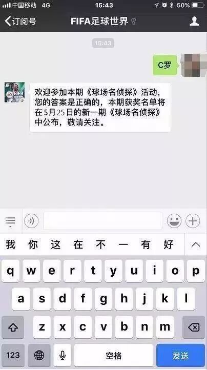 相信今天娜姐已经给了你们足够多的提示,请将你觉得正确的答案,回复到FIFA足球世界公众号(注意,不是在图文下方留言哦),假如你觉得答案是C罗,那就直接将C罗回复给公众号即可,示例如下图↓