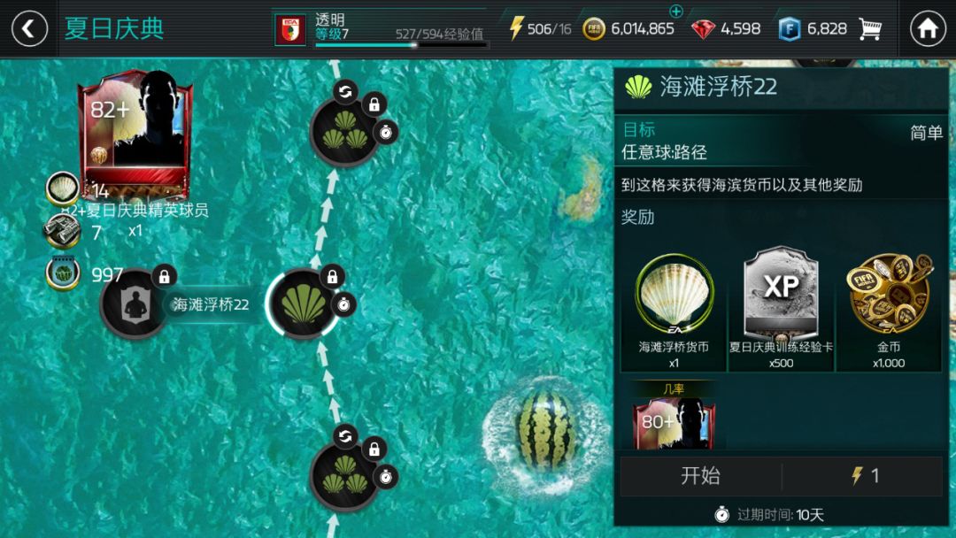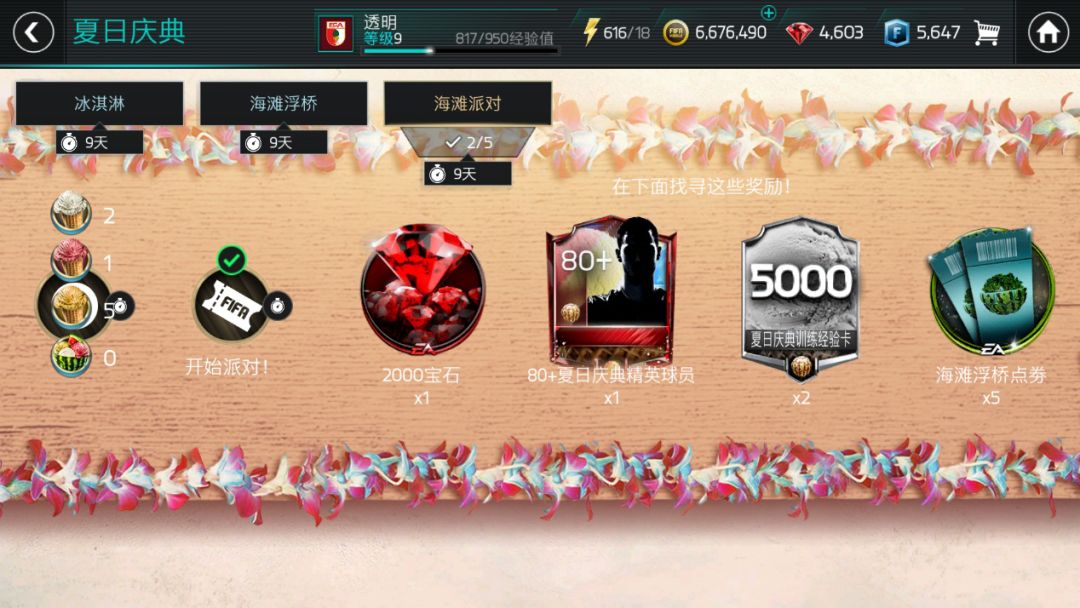使用刚刚获得的冰淇淋与圣代,您将可以在海滩派对章节兑换奖励!点击开始派对的按钮,您将可以看到 30个密封的奖励包裹 ,其中必定包含 2000宝石,1个80+夏日庆典精英球员,2张5000经验的训练经验卡,以及5个海滩浮桥点券 ,可以用于开启在海滩浮桥章节的冒险! 海滩浮桥