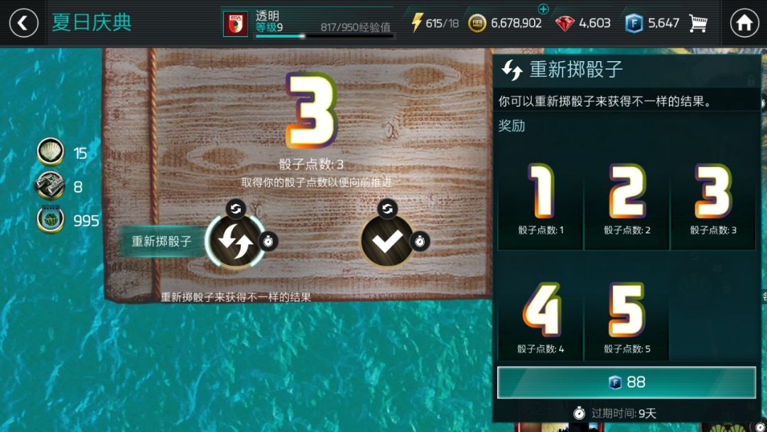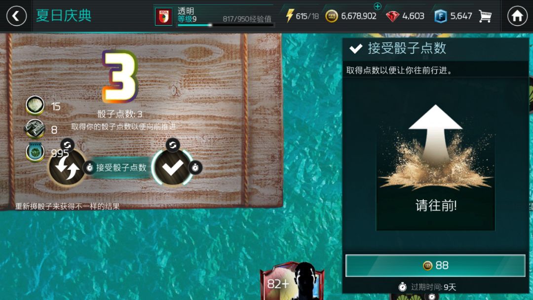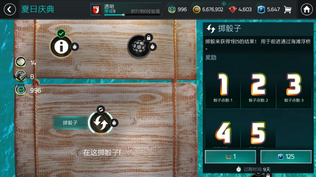 海滩浮桥章节是整个活动 最激动人心 的一环,使用之前章节获得的海滩浮桥点券,您可以投掷骰子, 获得随机的1-5点步数 ,这也将会是您在棋盘中移动相应的格数。 完成投掷后,您可以选择 重新掷骰子(会消耗您的点券) ,或是 接受骰子点数 。 只有您 停在相应的个数 ,才可以 完成相应的技巧挑战并领取奖励 ! 在棋盘中,还包含了一些 珍贵的球星奖励 ,等待您的发掘! 您同样需要停在相应的个数,才能使用海滩浮桥货币兑换球星卡奖励!此外,您只有 完成当前的技巧挑战 ,才能继续掷骰子,向前移动! 巨星展示