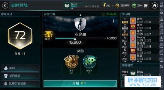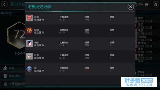 而点开实时对战界面的左下角的奖励和比赛历史记录按钮,我们将可以看到对应不同段位所能够获得的丰富奖励,并且可以看到球队过往的历史对战战绩。