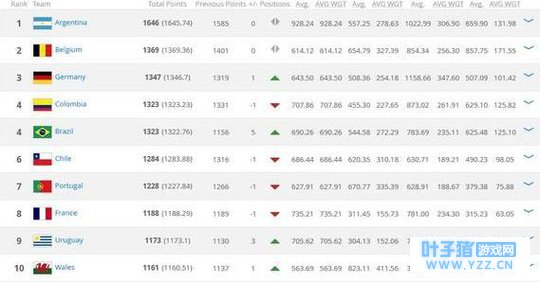巴西队重返世界前四 9月初的国际比赛日过后,一些球队的FIFA排名发生了变动。阿根廷依旧高居榜首,比利时位居次席。而世界冠军德国队则超越哥伦比亚,来到第三名。后者和狂升五名的巴西队一同并列第四。