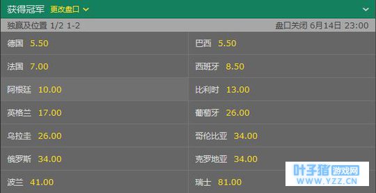 3月6日,2018俄罗斯世界杯正式迎来“倒计时100天”,博彩公司也即时更新了世界杯夺冠赔率,最新赔率数据显示,德国和巴西被视为头号夺冠热门,同时以1赔5.50并列第一,法国列第三,赔率为1赔7.00,西班牙则1赔8.50列第四,拥有梅西的阿根廷则1赔10列第五。 德国是上届巴西世界杯冠军。世界杯历史上,日耳曼战车共4次捧起大力神杯,仅次于5次夺冠的巴西,但德国人还有4次屈居亚军,是打进决赛最多的球队。本届世界杯德国与韩国、墨西哥、瑞典同组,小组出线几乎没有悬念。勒夫目前已执教球队12年之久,前后带队参加过5届重大赛事:2008年欧洲杯、2010年世界杯、2012年欧洲杯、2014年世界杯和2016年欧洲杯。