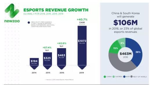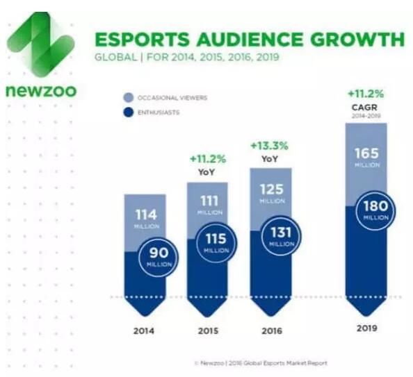 和传统体育一样,大型赛事才是电子竞技能蓬勃发展的核心要素。赛事的举办可以产出明星选手,让普通玩家观赏顶尖的技术性比赛,提高话题热度,并树立品牌价值从而实现商业化。 根据Newzoo的数据, 2016年电子竞技的市场收入增加了43%达到4.63亿美元。而到2019年,电竞收入有望增加到11亿美元。