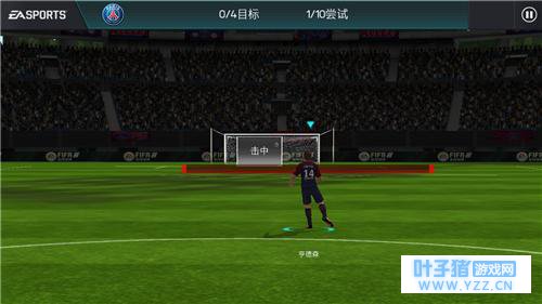 以任意球中场得分为例,我们需要将球射入球门的指定区域,而且不能让球落在球门前的红色区域,必须满足两个要求才能完成任务。该任务不难,只要在射门时加大力度,即可完成。