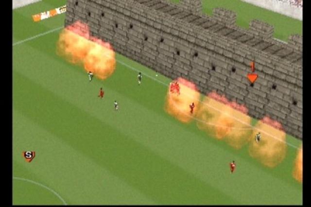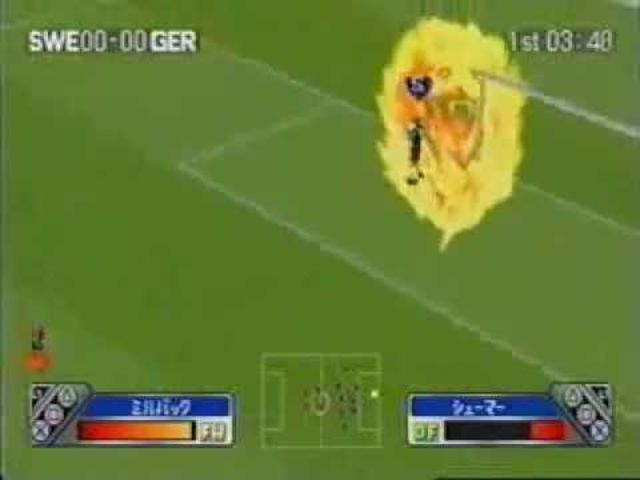 《爆烈足球》(爆烈サッカー) 在众多足球游戏之中,笔者最难以忘怀也是最诚意推荐的就是这款《爆烈足球》。当这世界上未出现《实况足球》和《FIFA》之前,家用机上的足球游戏几乎都是由TECMO包办,而TECMO除了推出一本正经的《世界杯足球》和《实况足球》外,还在2002年的PS上推出《爆烈足球》,一款以世界杯为主题的足球游戏,不过却不是正常的世界杯,而是比少林足球还夸张的世界大战。 《爆烈足球》基本上沿用《实况足球》引擎,但却加入完全疯狂的超级必杀技,你以为上述介绍的《热血足球》、《世嘉暴力足球》已经很夸张了吗?少年,你玩的足球游戏还是太少啊! 《爆烈足球》每一队都有一招代表国家的超级必杀技,例如巴黎队可以召唤巴黎铁塔拦截高空波、中国队可召唤万里长城在中场拦着所有人前进、美国队则可以召唤自由神像……,每一件吉祥物都是最具代表性的建筑物,只要在比赛中储满能量槽便可以放出,有些球队甚至有一攻一守共两招的必杀技,在搞笑之余,游戏难度也不是很低,但却是笔者十分推荐的足球游戏!