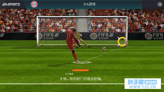 十二码线上的较量——点球如果在FIFA足球世界里获得点球,这是最容易破门的定位球机会了。如果把点球打飞,相信谁都会觉得沮丧。怎么样才能更好地处理点球呢,这里有几个需要大家注意的地方。 首先,点球的射门操作方法跟任意球射门基本相同,都是通过手势进行滑动操作来完成, 滑动速度决定力量和高度,方向决定球的飞行轨迹 。点球总体上看起来是比任意球简单的,但是点球的方向和力度的控制需要更多的技巧。如果滑动速度太慢,球速过慢会被门将直接拿到;如果速度快了,又会飞出球门。所以需要玩家更精准的微操。