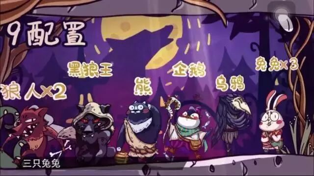 9人局角色配置 狼人X2、黑狼王、熊、企鹅、乌鸦、兔兔X3 屠边局
