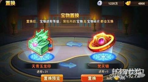 宝物置换系统是对我们手中背包中闲置的物件进行置换,从而换区可供使用的新属性,从而使我们增幅战力!4 宝物置换规则: 不可以置换相同的宝物、置换不出玩家已经穿戴的宝物,置换的宝物只能是玩家同质级别的宝物、置换之后宝物的进阶等级碎片等都会互换,进行宝物置换需要花费50元宝,但是置换后同样保留!