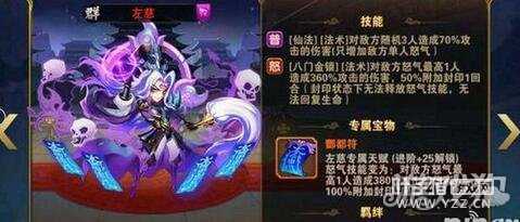 普攻:[物理]对敌方横排造成70%攻击的伤害(只增加敌方单人怒气) 技能:[物理]对敌方横排造成215%攻击的伤害,20%附加致盲1回合(致盲状态下命中下降100%) 专属天赋(专属宝物进阶+25解锁):[物理]对敌方横排造成225%攻击的伤害,40%附加致盲1回合(致盲状态下命中下降100%) 进阶+6:全体吴国武将物理伤害+5%(无法影响主角),普通攻击时造成的伤害有60%可转化为自身生命 进阶+8:被普攻时40%概率反击敌方横排,造成75%攻击伤害 进阶+10:普攻和怒攻后给自己提升10%伤害和5%免伤,5%被治疗率,持续3回合,可叠加5次 接下来再来回顾下左慈有哪些特别的能力: