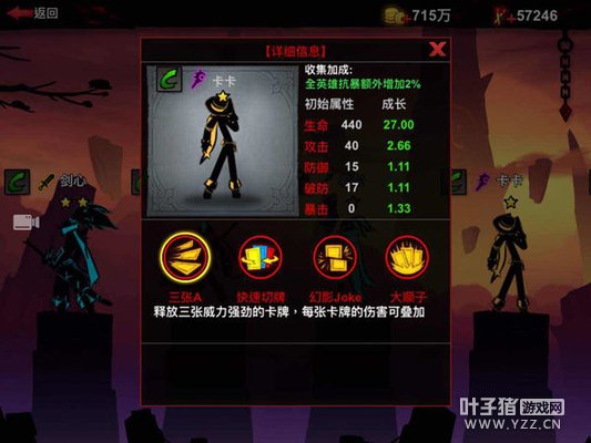 名称:卡卡 属性:射手 初始属性、成长: 生命:380、27.00 攻击:40、2.66 防御:17、1.11 破防:17、1.11 暴击:0、1.33 抗暴:0、1.33 星级:1星