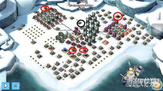 先干掉下面和右边的AOE,右边就剩一菊花,无论你是妹子、坦克还是屌丝兵,配合震爆和机器人尽情推吧……最后炸掉最上面的红圈的火箭,在黑圈位置就可以快快乐乐打大本了。第一波把本下方的震爆牙签火箭拔掉,第二波右侧登录拔掉牙签胖妹清理防御,第三次纯妹爆本。2波即可 一波清本下面火箭,蓝枪,毁灭迫击炮能打几个就打几个,第二波打掉左下毁灭 然后打迫击炮 最后输出爆本就好了。