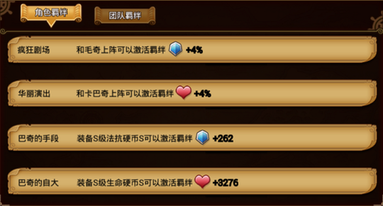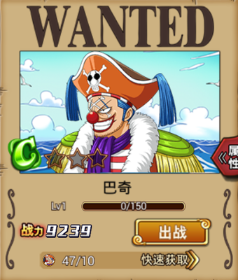 1、疯狂剧场:和毛奇同时上阵时可以增加4%的物理防御 2、华丽演出:和卡巴奇同时上阵时可以增加4%的生命 3、巴奇的手段:装备法抗硬币S时可以增加262的物理防御 4、巴奇的自大:装备 生命硬币S时可以增加3276的生命 获取途径:星级奖励、竞技场积分兑换、商城、活动,航海日志等 属性类型:物攻型 技能介绍及使用心得: 普通攻击: 普通攻击以6个动作为一轮,第五个动作是双脚飞出形成旋转刀环向前飞进,第六个动作是身体向前扑进双手往前攻击,形成单线范围伤害。 技能介绍