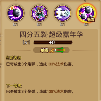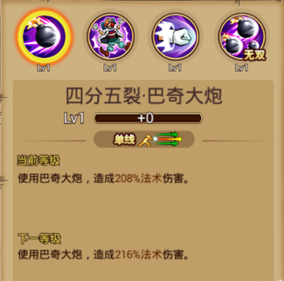 ①普通技能:四分五裂·巴奇大炮 基本介绍:单线攻击,使用巴奇大炮,造成大量法术伤害。 使用心得:使用该技能是会有一个全身跳起的动作,释放一个单线的炸弹,该炸弹触碰到敌人爆炸:未触碰到敌人,则向前飞进4秒后爆炸。该技能可频繁使用,CD时间较短。