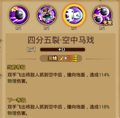 ③普通技能:四分五裂·空中马戏 基本介绍:三线攻击,双手飞出将敌人抓到空中后,装向地面,造成单次物理伤害。 使用心得:使用该技能时双手分裂飞出,抓住敌人,将敌人撞向地面。该技能可配合 嘉年华技能使用,形成连招,再使用空中马戏技能闪现到敌人旁边进行普通攻击。也可配合普通攻击使用,最后使用巴奇大炮结束。